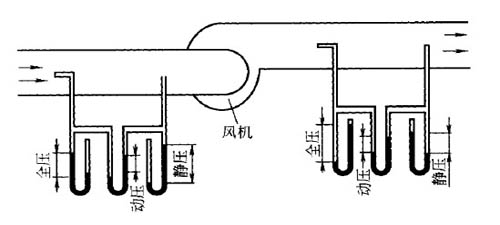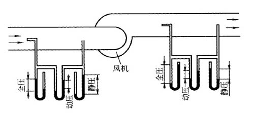 測(cè)量氣體的壓力應(yīng)在氣流比較穩(wěn)定的管段進(jìn)行,所謂平穩(wěn)的管段應(yīng)該是離開彎頭、三通、變徑管閥門等影響氣流流動(dòng)的管段。測(cè)試中需測(cè)定氣體的靜壓、動(dòng)壓和全壓,測(cè)全壓的儀器孔口要迎著管道中氣流的方向;測(cè)靜壓的孔口應(yīng)平行于氣流的方向。風(fēng)道中氣體壓力的測(cè)量如圖所示,圖中示出了動(dòng)壓、靜壓、全壓的關(guān)系。