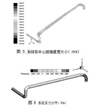 分布情況。由圖可知,系統速度大小為 6. 76 ~ 33. 8m /s,_值出現在彎頭的內側且大于煙氣入口值,_小值出現在彎頭的外側,直段的速度約在 19. 4 ~21. 2 m /s,壓力_值出現在彎頭的外側,_小值發生在彎頭的內側,且_個彎頭外側壓力值明顯高
